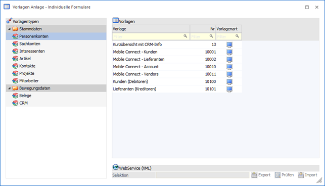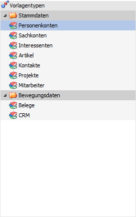 Zuerst muss ausgewählt werden, welcher Vorlagentyp bearbeitet werden soll. Dabei wird zwischen den Vorlagen für "Stammdaten" und "Bewegungsdaten" unterschieden.