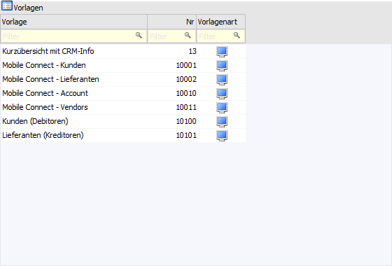 In der Vorlagentabelle werden alle Vorlagen des ausgewählten Typs angezeigt.