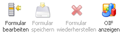Beim Umschalten auf den "Bearbeiten"-Modus werden die Buttons (mit Ausnahme des Ende-Button und des "Formular bearbeiten/speichern/zurücksetzen"-Buttons) gegraut. Wenn es sich um ein Formular mit mehreren Registern handelt, werden auch die Register-Buttons gegraut, da ein Umschalten des Registers in diesem Bearbeitungsstatus nicht möglich ist. Die Register eines Formulars müssen einzeln bearbeitet werden. Bei einem erneuten Klicken des Buttons "Formular bearbeiten" wird wieder in den Editier-Modus gewechselt und die Änderungen an der Vorlage bleiben erhalten. Wurden die Änderungen am Formular bisher noch nicht gespeichert, können jetzt (wie auch schon während des Bearbeitens) mittels Buttons die Änderungen gespeichert oder verworfen werden.