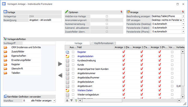 Grundsätzlich unterscheidet sich die Anlage von Vorlagen des Typs "CRM" nicht von der Anlage anderer Typen. Aus diesem Grund werden in diesem Kapitel nur die Spezial- bzw. Sonderfunktionen beschrieben.