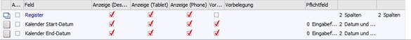 Sind in den CRM-Vorlagen die Felder "Startdatum" und "Enddatum" bzw. "Kalender Start-Datum" und "Kalender End-Datum" vorhanden, so wird bei deren Eingabe geprüft, dass das Startdatum (Kalender Start-Datum) immer VOR dem Enddatum (Kalender End-Datum) liegt.