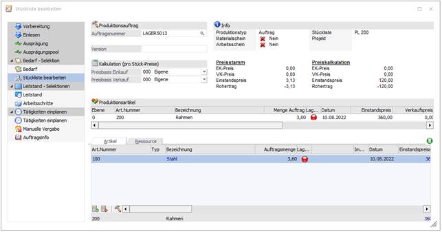 In dem Produktionsauftrag "Lager5013" gibt es den Artikel "100 - Stahl", welcher Lagerorte verwendet.