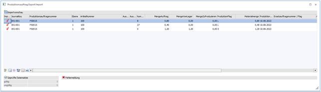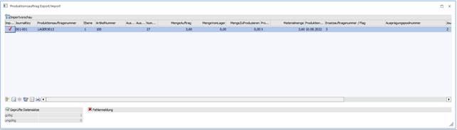 In der Importdatei muss es bei der Endmeldung die Hauptartikelzeile geben, damit bei einer Teilendmeldung die Restmengen korrekt berechnet werden können. Die Journalzeile muss korrekt sein. Diese kann man sich sonst am einfachsten über einen Export des Produktionsauftrag ermitteln.