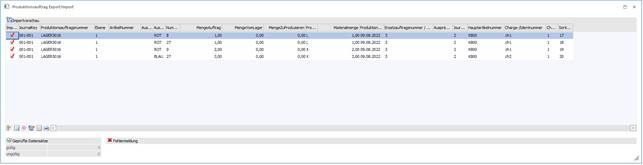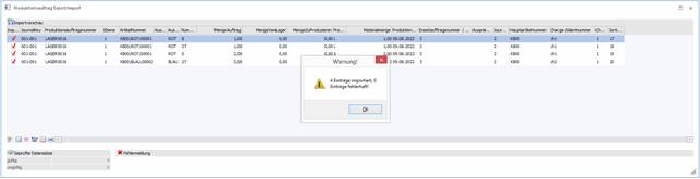 In der Importdatei wird die Lagerort ID angegeben, sowie ein Eintrag bei der ErsatzauftragsnummerFlag. Das Produktionsflag beinhaltet den Wert "X" oder es kann die Zeile den Wert "L" haben.