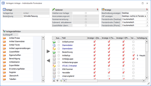 Die Definition der Felder erfolgt wie bei allen anderen Vorlagen auch. Allerdings steht folgendes Sonderfelder bzw. -funktionen zur Verfügung.