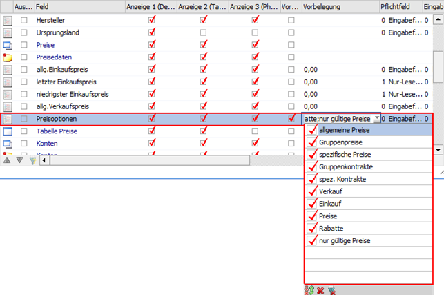 Ist dieses Feld in der individuellen Vorlage enthalten und werden die anzuzeigenden Preisoptionen in der Auswahlliste verändert, so wird die Preistabelle aktualisiert / neu aufgebaut. Nicht gespeicherte Tabelleninhalte können dadurch ggfs. verworfen werden.