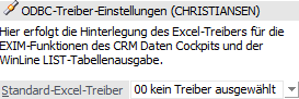 Der hier gewählte ODBC-Treiber wird bei den Exportfunktionen des CRM Daten Cockpits (Button "Export") und der WinLine Tabelle verwendet. Dieser Eintrag wird pro Arbeitsplatz gespeichert, aus welchem Grund auch die Bezeichnung des aktuellen Rechners im Fenster angezeigt wird.