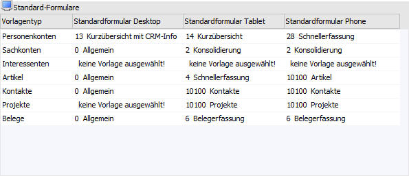 In der rechten Tabelle kann für einzelne Vorlagentypen ein Standardformular ausgewählt werden. Es kann ein Standard-Formular bei den folgenden Vorlagentypen hinterlegt werden: