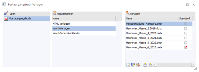 Durch Anwahl des Buttons "Vorlage (Office / HTML)" im "Postausgangsbuch" können Vorlagen für die Übergabe an Microsoft Word eingebunden und verwaltet werden.