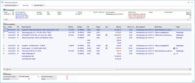 Durch Anklicken einer beliebigen Buchungszeile gelangen Sie in den Regelassistenten für den Zahlungsausgleich, um die Konten- und/oder Fakturen-Selektion durchzuführen.