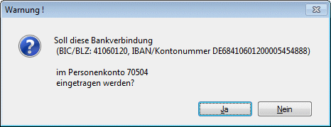 Beim Doppelklick auf das Symbol kommt eine Abfrage und die Bankverbindung kann in das Personenkonto übernommen werden. Existiert bereits eine Standard-Bankverbindung im Personenkontenstamm, dann wird die Bankverbindung in die "weiteren Bankverbindungen" des Personenkontos übernommen.