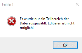 Werden nur Teilbereiche einer MT940-Datei eingelesen, z.B. ein Kontoauszug wird eingelesen wenn mehrere Kontoauszüge in der MT940-Datei existieren, kann der Bearbeiten-Modus nicht aktiviert werden. Es kommt dann eine entsprechende Meldung.