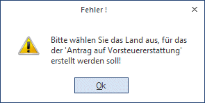 Wenn noch keine Steuerzeile ein Land eingetragen hat, dann kann der Menüpunkt "Vorsteuererstattung" nicht geöffnet werden.