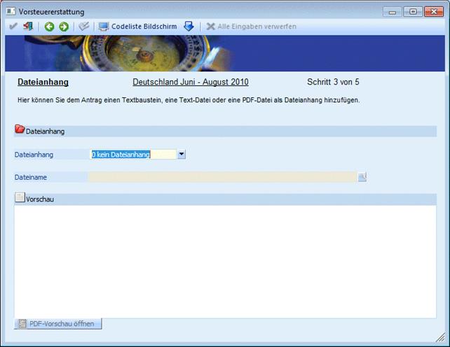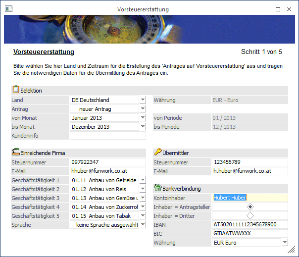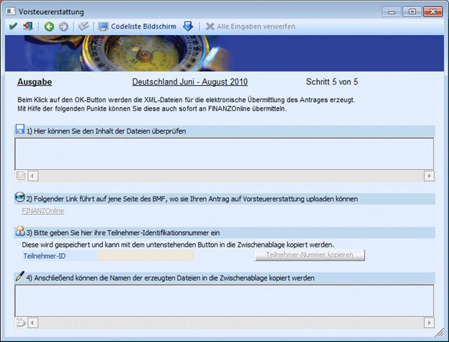 Die Vorsteuererstattung ist in 5 Schritten aufgebaut. Mit dem Assistenten wird man schrittweise durch die Erstellung eines Antrages geführt.