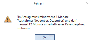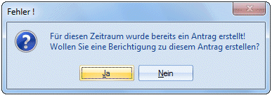 Wird der Eintrag "neuer Antrag" ausgewählt und es wird ein Zeitraum ausgewählt, für den bereits ein Antrag erstellt wurde, wird mit einer Meldung darauf hingewiesen, dass es für diesen Zeitraum nur einen Antrag geben darf.