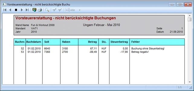 Wurden Buchungen gefunden, die nicht bei der Vorsteuererstattung berücksichtigt werden können, weil der Betrag negativ ist oder der Steuerbetrag Null beträgt, wird eine Liste dieser Buchungen gedruckt.