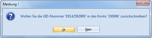 ü Eingabe der UID-Nummer oder Steuernummer. Eine geänderte UID-Nummer kann, wenn gewünscht, in den Kontenstamm zurückgeschrieben werden.