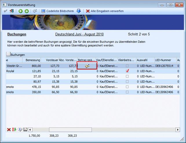 Im 2. Schritt werden alle betroffenen Buchungen mit dem Steuerkennzeichen "Vorsteuer" und mit jener Steuerzeile, die das ausgewählte Land eingetragen hat, aufgelistet.