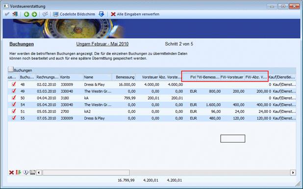 Wenn Buchungen nicht in der Landeswährung des Erstattungslandes gebucht wurden, werden in diesem Fall 4 neue Spalten in der Tabelle angezeigt: