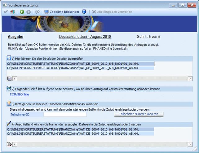 Anschließend können die Dateien an FINANZOnline übermittelt werden. Wie aus den anderen FinanzOnline-Fenstern bekannt, gibt es einen Link auf die FinanzOnline-Startseite und die Möglichkeit die Teilnehmer-ID zu speichern und in die Zwischenablage zu kopieren.