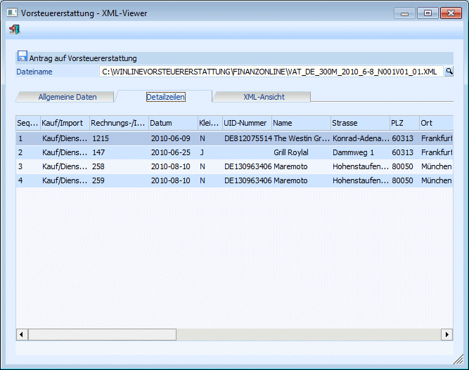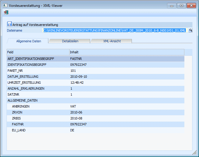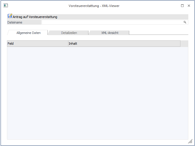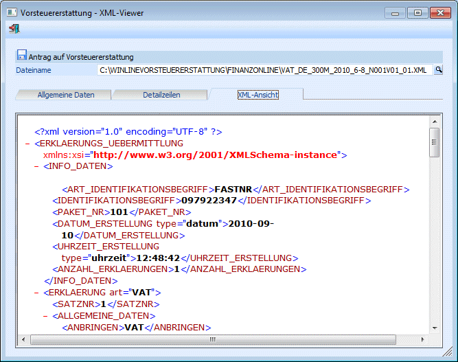 zu öffnen. In diesem Menüpunkt können die erzeugten XML-Dateien der Vorsteuererstattung in "lesbarer" Form dargestellt werden.