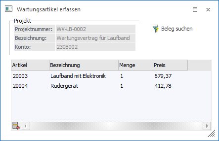 Es werden nur jene Artikel angezeigt, welche im Artikelstamm im Register Lager beim Typ Serviceprojekt "eröffnen" eingestellt haben.)