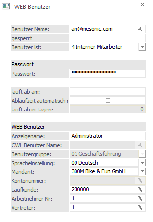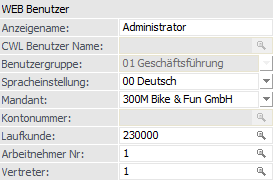 Hier kann der Name des Benutzers eingegeben werden, der im WEB angezeigt werden soll. Bleibt dieses Feld leer, so fällt das Programm auf den jeweiligen Stammsatz zurück. D.h. handelt es sich bei dem WEB Benutzer um z.B. einen Vertreter (Hinterlegung einer Vertreternummer) und wird dieses Feld leer gelassen, so wird im WEB der Name des Vertreters angezeigt. Gleiches gilt natürlich z.B. auch beim Arbeitnehmer.