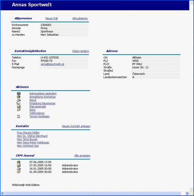 Das Fenster WEB CRM, das durch Anklicken des Buttons "WEB CRM" in verschiedenen Menüpunkten aufgerufen werden kann (Personenkontenstamm, Vertreterstamm, Arbeitnehmerstamm, Namen suchen) zeigt die Stammdatenansicht für den jeweiligen Stammdatensatz in einem Fenster der WEBEditon. Dabei sind neben den Stammdaten auch Historienschritte und Workflows sichtbar. Weiters können auch neue Aktionen für den Stammsatz ausgelöst werden. Voraussetzung dafür ist, dass die WEBEdition eingesetzt wird.