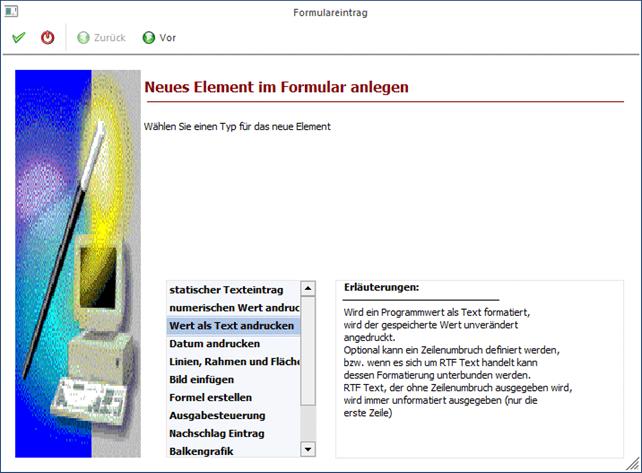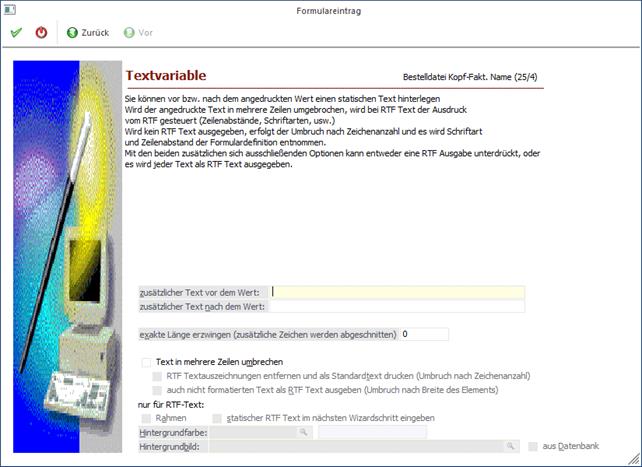 Durch Anklicken des VOR-Buttons können weitere Einstellungen zum Andruck der Variable eingegeben werden. Durch Anklicken des ZURÜCK-Buttons kann nochmals der Typ verändert werden. Durch Drücken der F5-Taste wird der Eintrag in das Formular übernommen. Durch Drücken der ESC-Taste wird das Fenster geschlossen.