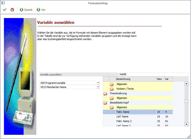 Durch Anklicken des ZURÜCK-Buttons kann die verwendete Variable verändert werden. Durch Drücken der F5-Taste wird der Eintrag in das Formular übernommen. Durch Drücken der ESC-Taste wird das Fenster geschlossen.