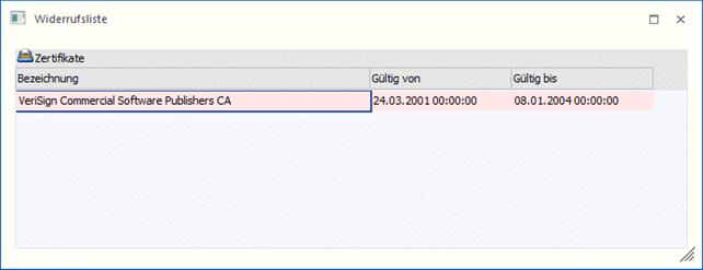 Wurde eine Widerrufsliste neu importiert, so kann durch Drücken des OK-Buttons die Anzeige in der Tabelle aktualisiert werden.