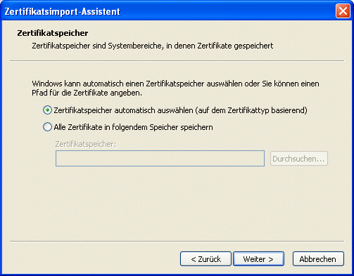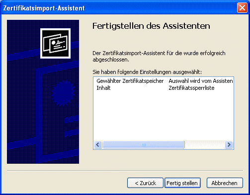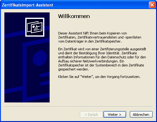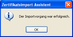 Dazu wird der Zertifikatsimport-Assistent aufgerufen, in dem die einzelnen Schritte mit "Weiter" sowie der letzte Schritt mit "Fertigstellen" bestätigt werden müssen: