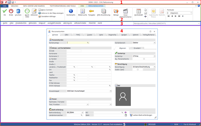 Der WinLine Bildschirm bietet eine Vielzahl von Funktion und Informationen. Hierbei ist die Darstellung in die folgenden Bereiche untergliedert: