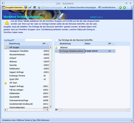 Sie haben die Möglichkeit die Kalenderausgabe auf einen bestimmten Workflow-Schritt einzuschränken oder alle drei verfügbaren Exchange Workflow-Schritte einzubeziehen.