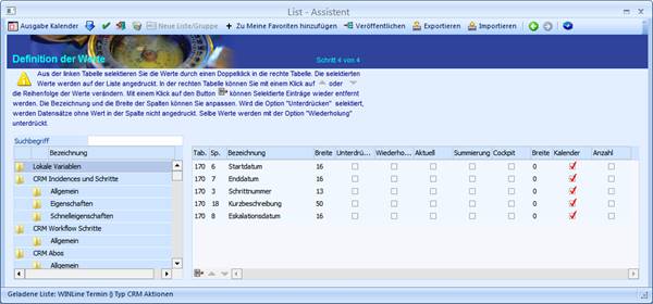 Im dritten und letzten Schritt wird nun definiert, welche Werte (Variablen) auf der Liste gedruckt werden sollen. Um die Werte im Kalender anzuzeigen, muss die Checkbox für Kalender aktiviert werden.