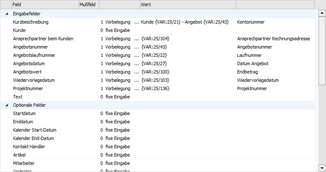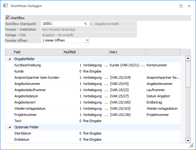 Wenn in einem Workflow bzw. einer Aktion ein Fenster und eine Vorlage hinterlegt wurden, dann wird die Vorbelegungstabelle gemäß dem Aufbau der Vorlage gefüllt.