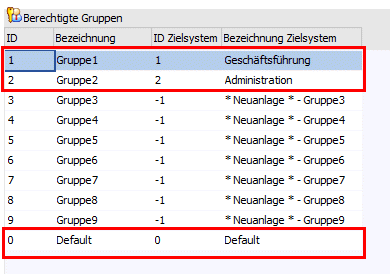Im Importfenster werden diese Gruppen mit den bereits vorhandenen Gruppen "0 Default", "1 Geschäftsführung" und "2 Administration" belegt. In der Spalte "ID Zielsystem" kann dies indiv. geändert werden.