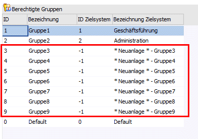 Des Weiteren sind in der Importdatei als "berechtigte Gruppen" die Gruppen 3 bis 9 enthalten. Durch Angabe des Wertes "-1" kann festgelegt werden, dass diese Gruppe als neue Benutzergruppe angelegt werden soll