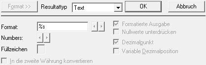 Je nach Resultattyp wird hier "%s" (Text), "###,###,###.##" (numerisch) oder "{DATETIME}" (Datum) dargestellt und kann beeinflusst werden.