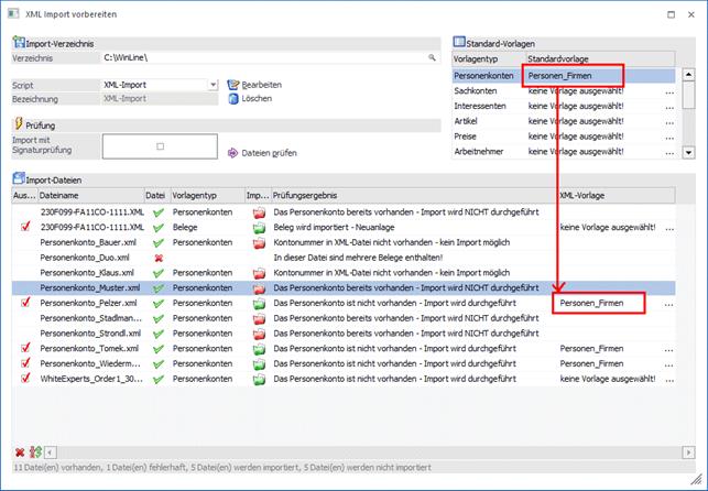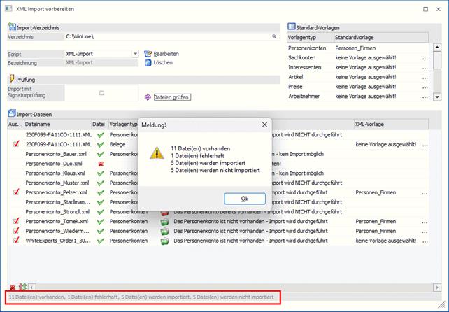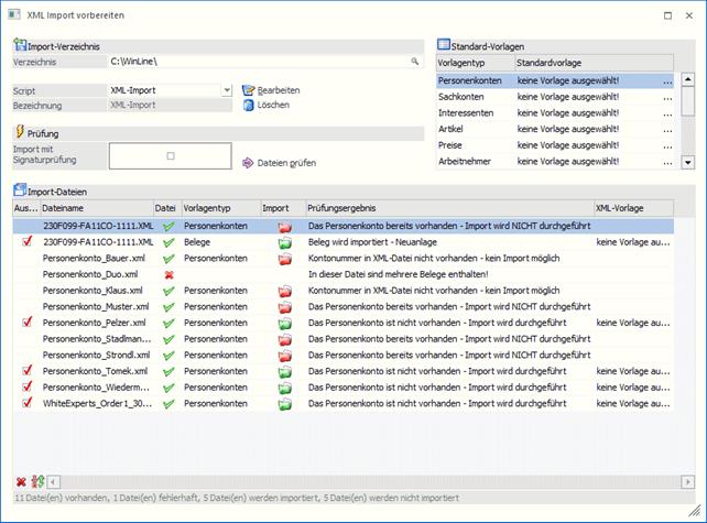 Das Ergebnis dieser Prüfung wird in der Tabelle dargestellt; parallel dazu wird auch ein Protokoll auf dem eingestellten Drucker ausgegeben. Das Ergebnis der Prüfung (wie viele Dateien können importiert werden usw.) wird in einem eigenen Fenster dargestellt und zusätzlich im Fenster "XML Import vorbereiten" in einer Statuszeile angezeigt.