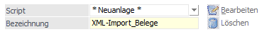 Mit dem Eintrag "Neuanlage" können neue Scripts erfasst werden. Diese stehen mandantenübergreifend zur Verfügung. Wird der Eintrag "Neuanlage" gewählt und anschließend der Button "Bearbeiten" gedrückt, so kann in einem weiteren Eingabefeld die Bezeichnung des Scripts angegeben werden.