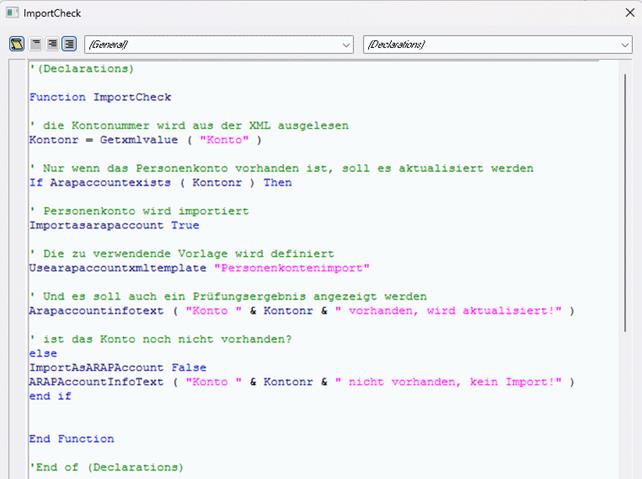 Im Menüpunkt "XML Import vorbereiten" kann im Vorfeld mittels VB-Script bestimmt werden, ob XML-Dateien importiert werden sollen bzw. wie und mit welcher Vorlage dies erfolgen soll.