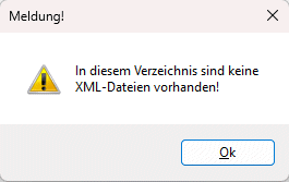 Durch Drücken dieses Buttons werden die XML-Dateien aus dem gewählten Verzeichnis eingelesen und mittels VB-Script geprüft. Sind im angegebenen Verzeichnis keine XML-Dateien enthalten wird dies mit entsprechender Meldung angezeigt: