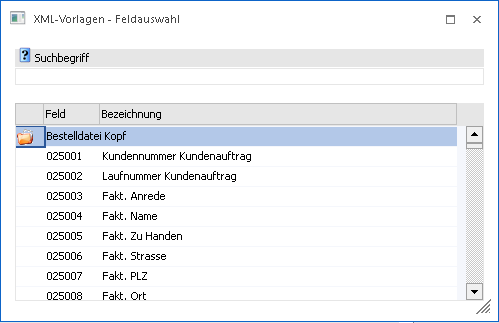 In diesem Fenster kann nach allen Feldern gesucht werden, die als Importfelder übernommen werden können. Dabei ist es davon abhängig, welcher Import durchgeführt wird, aus welchen Feldern ausgewählt werden kann.