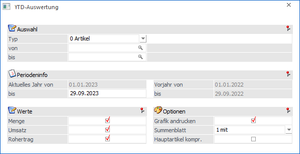… aufgerufen werden kann, gibt für unterschiedliche Typen die Information "Menge", "Umsatz" und "Rohertrag" aus. Die Abkürzung "YTD" steht hierbei für "Year-to-Date" und bedeutet, dass die Werte des aktuellen Jahres mit denen des Vorjahres verglichen werden, wobei ein Stichtag vorgegeben wird.