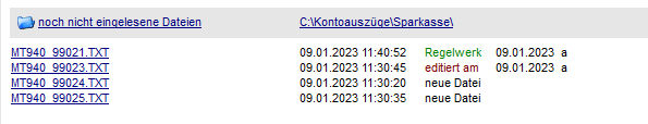 Wurden nicht alle Kontoauszüge einer MT940-Datei ausgewählt und der Buchungsstapel erzeugt, wird die komplette Datei verschoben (sofern die entsprechende Einstellung gesetzt ist) oder die Datei befindet sich in der Dateiliste "bereits eingelesene Dateien". Von dort aus kann die Datei nochmals ausgewählt, der noch zu verbuchende Kontoauszug markiert und eingelesen werden.