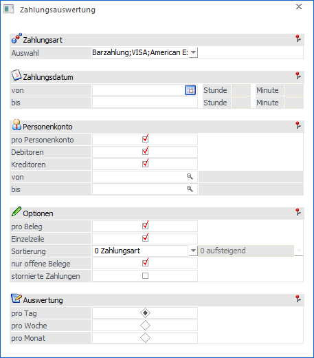 Über diese Felder kann auf einen bestimmten Zeitraum eingeschränkt werden, für welchen die Auswertung ausgegeben werden soll. Werden keine Datumsgrenzen gesetzt, so kommen alle Zahlungen in die Auswertung.