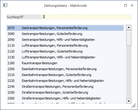 In diesem Fenster, das im Sachkontenstamm im Feld "Statistikkennzeichen" aufgerufen werden kann, kann nach allen Dienstleistungsarten gesucht werden.
