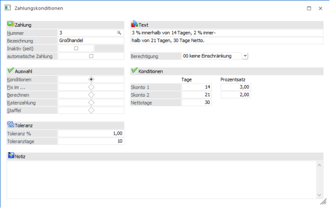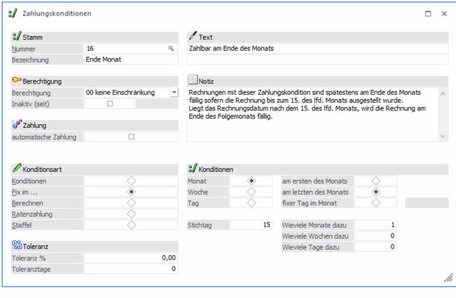 Die Felder "Toleranz %" und "Toleranztage" können nur bei den Zahlungskonditionsarten "Konditionen", "Fix im ..." und "Berechnen" hinterlegt werden.