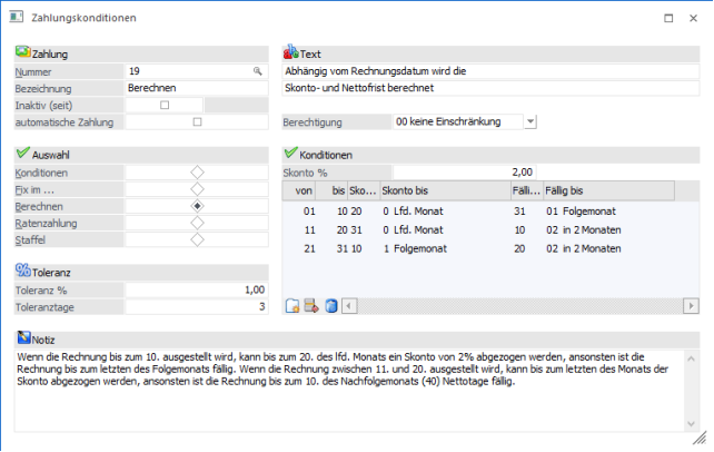 Damit sind alle Varianten von Fakturenkonditionen wie z.B. "erstes Drittel